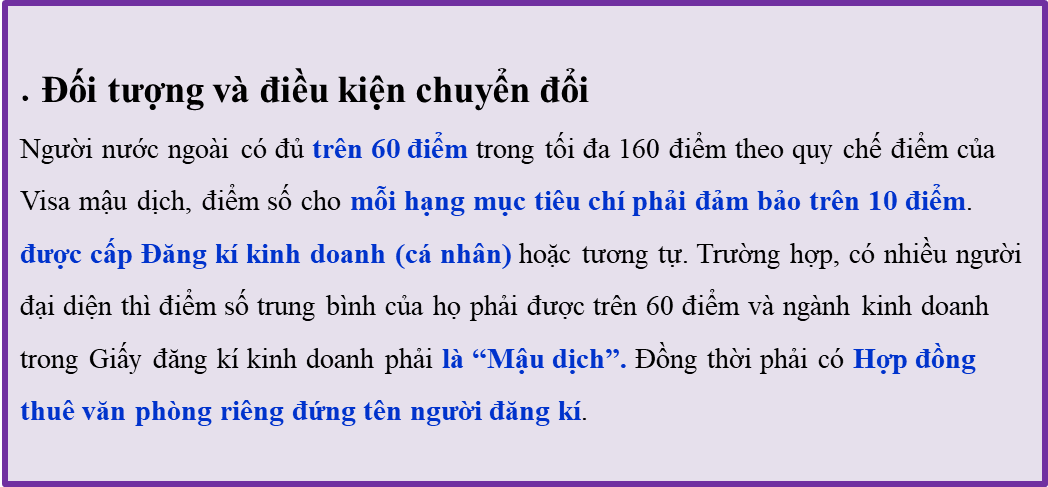 Visa mậu dịch ( Kinh doanh cá nhân) Visa mậu dịch là loại visa được cấp theo phương thức tính điểm dựa trên những tiêu chí như mức độ chuyên môn về mậu dịch, thời gian lưu trú tại Hàn Quốc, nhằm mang lại cơ hội lưu trú tại Hàn Quốc cho người nước ngoài có chuyên môn tốt trong ngành mậu dịch. Điều kiện để nhận Visa này khá đa dạng, việc gia hạn visa cũng dựa vào những tiêu chí như quy chế tuyển dụng và thành tích thương mại. Sau khi cân nhắc thấy người đăng kí có đủ những điều kiện về điểm theo quy chế điểm và không mắc những lỗi gây mất tư cách đăng kí thì họ sẽ được chấp thuận chuyển đổi và cấp Visa mậu dịch. Những ai có đủ điều kiện và có thời gian lưu trú tại Hàn Quốc đủ dài (Ví dụ như du học sinh D-2) đều có thể tham gia chuyển đổi visa mậu dịch này. Nhưng, để tránh trường hợp lạm dụng nhằm lưu trú mà không liên quan tới mục đích mậu dịch, Hàn Quốc quy định cần phải có điều kiện về thành tích thực nhất định trong mậu dịch khi gia hạn Visa này.