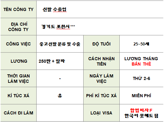 | [VIỆC LÀM] Visa F - Cung cấp chỗ ở , tham gia 4 loại bảo hiểm , gia hạn visa [경기도 포천시] | |||